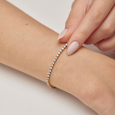 Elegáns tenisz stílusú, aranyozott BROSWAY acél karkötő, apró, átlátszó cirkóniák folyamatos sorából. Rendszeres elhelyezésük lágy, egyenletes fényt kölcsönöz, amely nőiesnek és időtlennek tűnik.