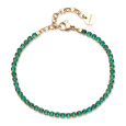 Elegáns tenisz stílusú, aranyozott BROSWAY acél karkötő, élénkzöld cirkónia sorral díszítve. A meleg arany tónus és a kövek intenzív smaragdzöld színének kombinációja egy luxus, nőies ékszert alkot, amely azonnal magára vonzza a figyelmet.