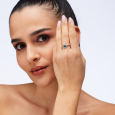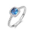 Ez az elegáns gyűrű egy központi világoskék cirkóniát tartalmaz, amelyet apró, átlátszó kövek vesznek körül. A finom csillogás és a harmonikus színkombináció kifinomult és ragyogó jelleget kölcsönöz neki.
