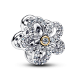 Az ezüst PANDORA gyöngy virág alakú, nyitott szirmokkal, átlátszó cirkóniákkal díszítve. A közepét egy aranyozott részlet egészíti ki, amelynek egyik oldalán egy cirkónia található.