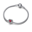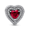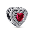 Ezüst PANDORA szív charm piros kristállyal és átlátszó cirkóniákkal díszítve.