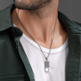 A POLICE férfi acél nyakláncot ezüst árnyalatú lánc és medál egészíti ki, amelynek sima felülete és dombornyomott mintája finom kontrasztot alkot.