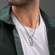 A POLICE férfi acél nyakláncot ezüst árnyalatú lánc és kereszt alakú medál egészíti ki, apró gravírozott részletekkel.