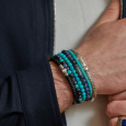 A sötétebb riolit, a kék szodalit, az elegáns hematit és a lágy türkiz kombinációja jellegzetes, mégis kiegyensúlyozott megjelenést kölcsönöz az ékszernek. A rugalmas kialakítás könnyű felhelyezést és kényelmes viseletet biztosít egész nap.