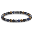 Női REBEL & ROSE karkötő, amely hematit, szodalit, kék és sárga tigrisszem természetes kövekből készült gyöngyöket kombinál acél márkajelzéssel, rugalmas dizájnban.