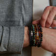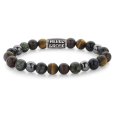 Férfi REBEL & ROSE karkötő, mely kék tigrisszemből, sárga tigrisszemből, breccsa jáspisból, riolitból és szürke hematitból készült gyöngyökből készült, rugalmas kivitelben.
