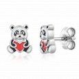 Gyermek ezüst panda fülbevaló tűzzománccal díszített szívvel.